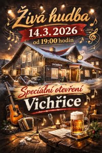 Weiter geht es am 14. März 2026 ab 19:00 Uhr mit der Sondereröffnung der Vichřice mit Live-Musik. Ein Abend voller Begegnungen, guter Stimmung und echter Bergatmosphäre erwartet Sie.