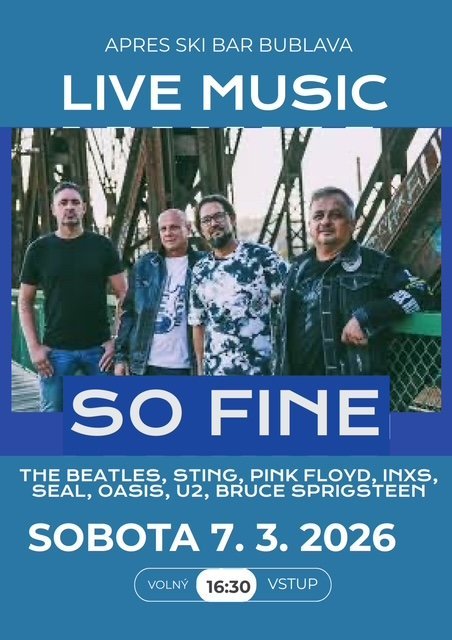Bereits am Samstag, 7. März 2026 ab 16:30 Uhr spielt im Après Ski Bar Bublava die Band SO FINE bekannte Welthits von Legenden wie The Beatles, Sting, Pink Floyd, U2 oder Bruce Springsteen. Freuen Sie sich auf großartige Musik, gute Getränke und eine entspannte Atmosphäre.